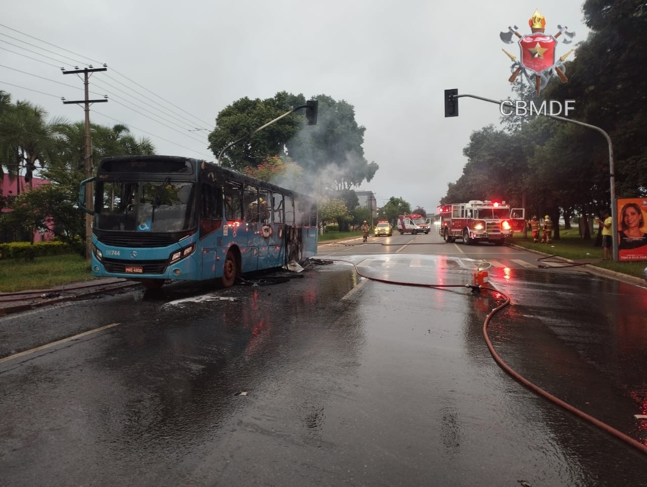 Um ônibus de transporte coletivo pegou fogo na manhã desta terça-feira (26), no Distrito Federal. O veículo fazia o trajeto de Águas Lindas de Goiás (Entorno do DF) para a Rodoviária do Plano Piloto.